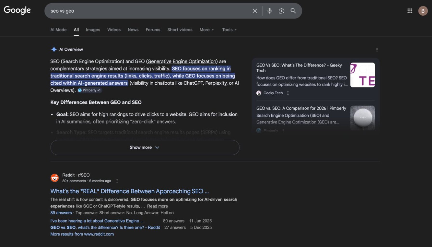 The biggest practical difference is in the traffic model. SEO drives clicks. GEO drives visibility - but that visibility doesn't always come with a visit to your website. The user gets their answer inside the AI interface, and your site is listed as a source they may or may not click.